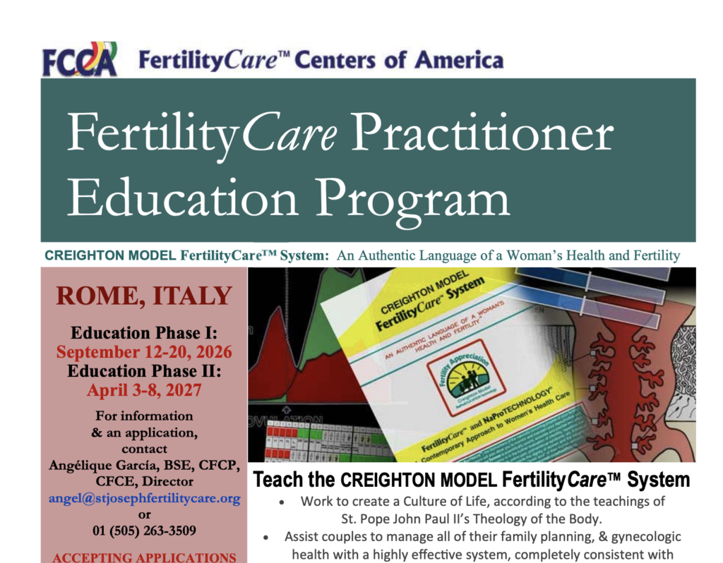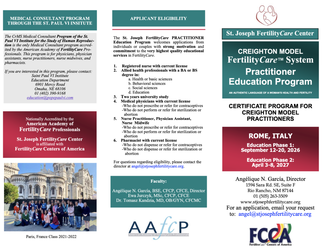 St. Joseph FertilityCare ™ Center Practitioner Education Program is directed by Angélique García, BSE, CFCE, and is located in Albuquerque, New Mexico, USA. This center has trained practitioners in the CREIGHTON MODEL FertilityCare ™ System for more that 30 years, in the USA, Mexico, throughout Europe & in Hong Kong.